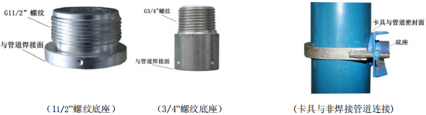 底座根据管道的材质不同(可焊接和不可焊接)分为焊接式底座、卡箍式卡具,即分为焊接和卡箍连接两种。安装时应使底座位于管道截面方向的顶点,并使底座通孔的轴心垂直于管道轴心。