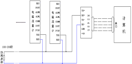 将电磁流量计的TXD和RXD与RS485的RX+和RX-(TX+和TX-也可)相连,如果接的线比较长请您在远端加一个100-200欧的匹配电阻,再把RS485插到微机的串口。