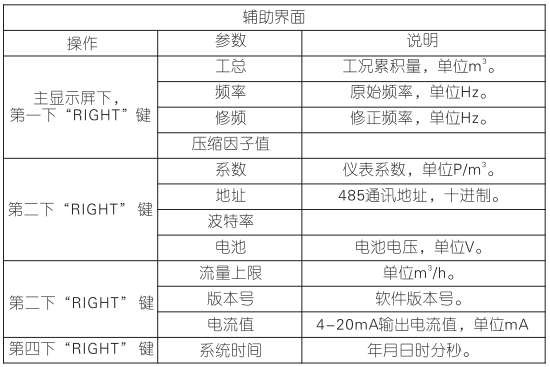 1、总量∶最多可保留小数点后三位,数字溢出后自动进位,超过10个9时,余数自动转存。工况总量和标况总量用单位区别,工况总量单位m²,标况总量单位Nm3。 辅助菜单说明