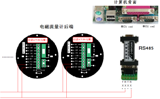 将电磁流量计的TXD和RXD与RS485的RX+和RX-(TX+和TX-也可)相连,如果接的线比较长请您在远端加一个100-200欧的匹配电阻,再把RS485插到微机的串口。